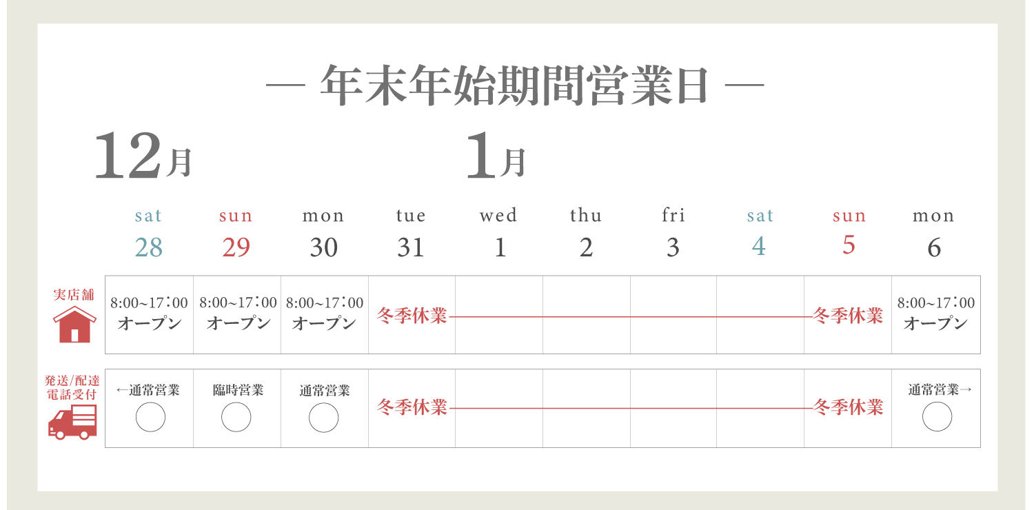 店舗営業および発送業務は以下のスケジュールとさせていただきます。